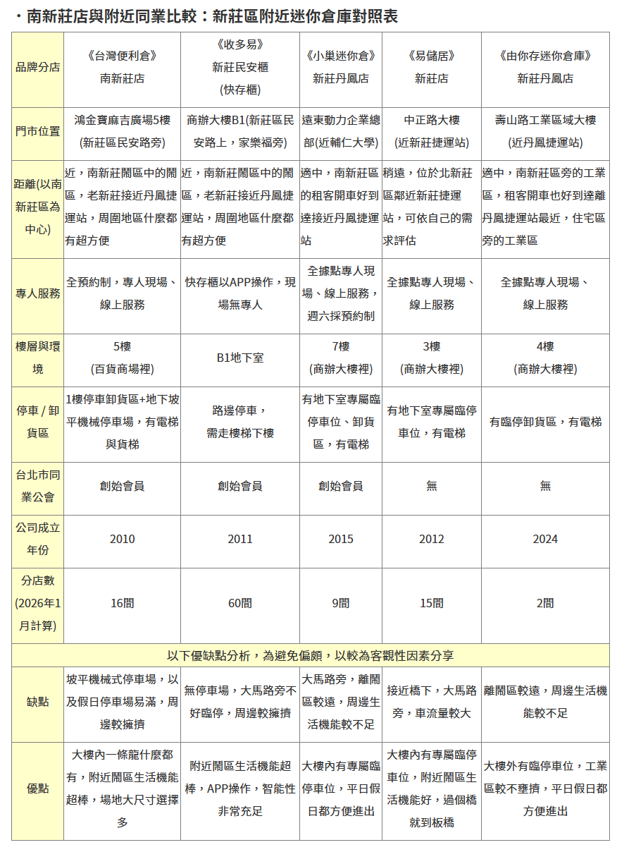 .南新莊店與附近同業比較:新莊區附近迷你倉庫對照表